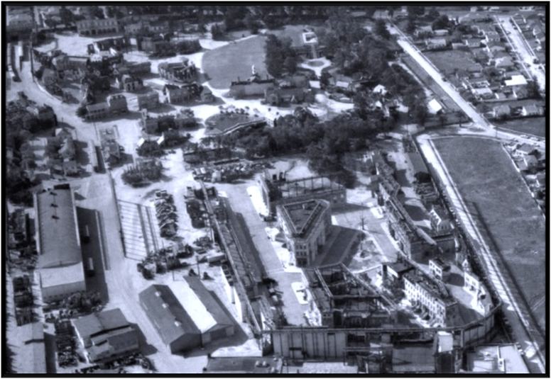 The Yellow home is the Hardy House North side that use to overlook Small Town Square, here being moved as to block view of Vets Tower and an oversized prop warehouse. Walk through the front door and nothing exists-drapes hide-nothing inside.