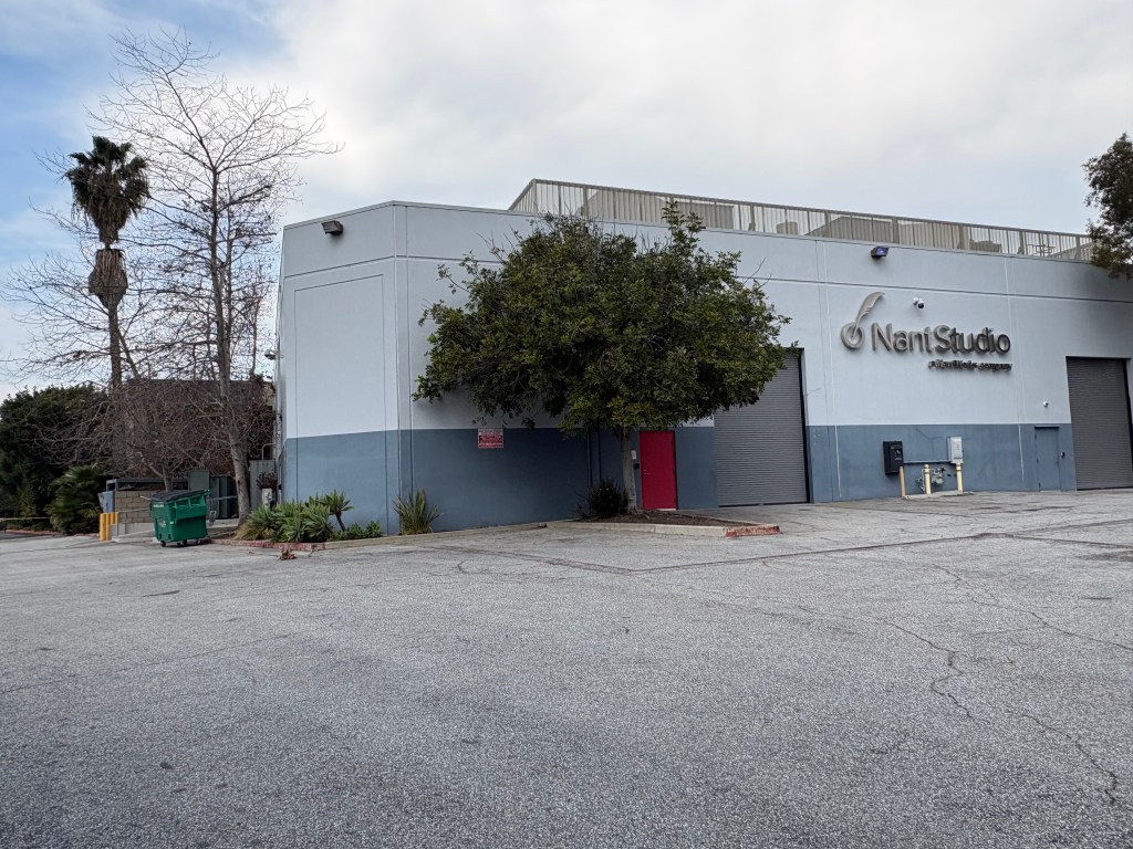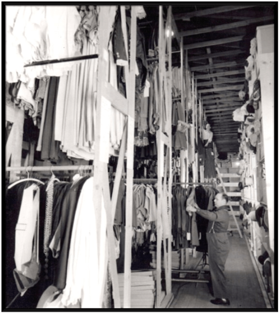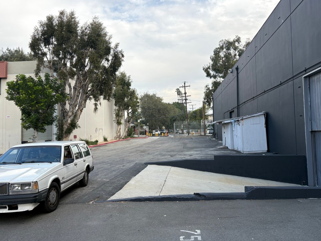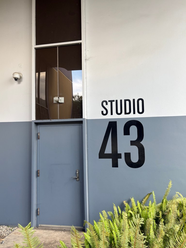 On the left side of this photo, the long hangar stores massive props, the white square building closest to us is attached and provides wardrobe on the backlot. We call it …The Helmet Room.