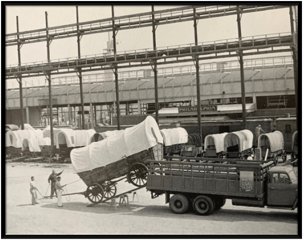 Wagons are seen here on Lot #2 for the filming of the movie Cimarron in 1960.