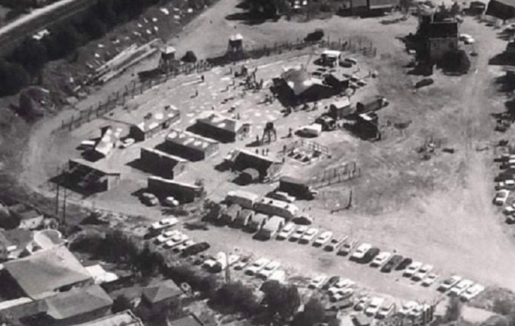 Picture I took in 1974 of fort from a rooftop in Small Town Square. A work light and tombstone can barely be seen. This set below the fort is a graveyard where Dr. Frankenstein and Igor exhume a body, in the pouring rain. This was a “hot set” and a guard was located there, Transylvania Station is right around the corner…