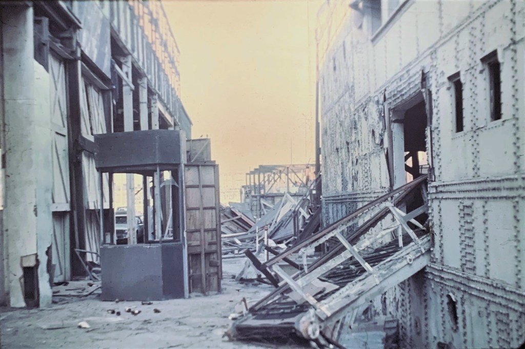 1978- The End of Carvel …From dust to dust-decades worth of memories…I was so disillusioned I anted to cry, I watched every backlot in Culver City disappear-one at a time. Only New York Street stayed up, until October of 1980.Notice the teeth on the Bulldozer in the dirt cloud, a single Bulldozer pushed these sets down from behind.