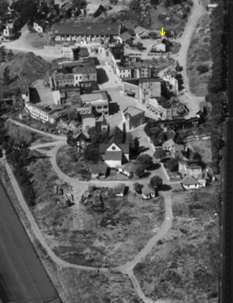 The white house top left of picture is someone’s home on Higuera street. The homes around the studio had views like this. The Mayberry R.F.D. house and a grass berm would later change this vantage point. The R.F.D. house would be a short distance from the white house in this photo.
