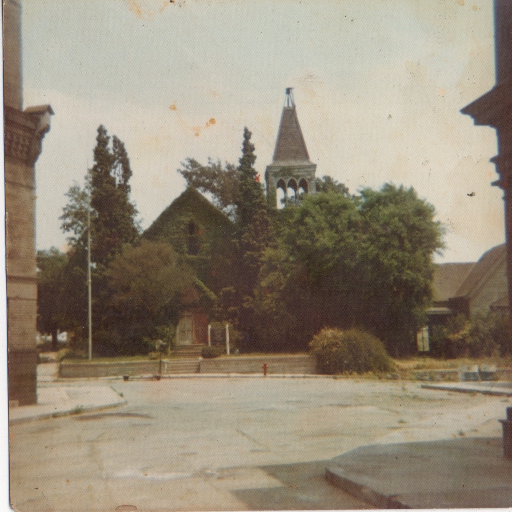 My picture of this church-1973. This was how the backlot looked in TV Land era. The steeple looked over the entire backlot. A straight up, nailed to the wall ladder, will take you to the belfry. It’s a good climb, worth the risk. The church schedule is the B/W sign. An ancient RKO light stands to the left of the stairs leading to the front door.