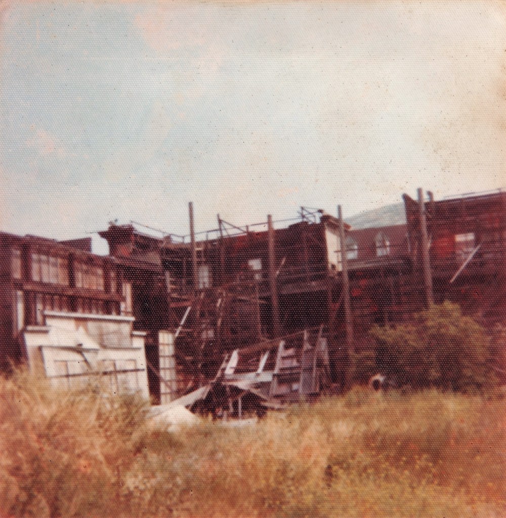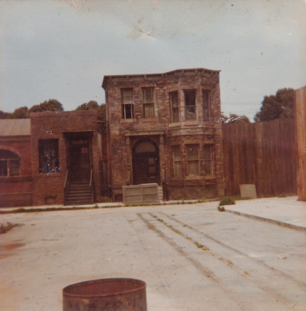 My picture-1973 A wood plank extends from the two story brick building to the roof of the one story next to it. There is a potential fall space between the two structures. They connect by a gang plank. It’s that or just jump.