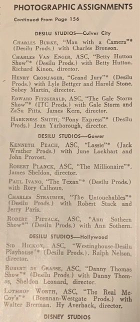 Camera man assignments-1960. Television’s beginnings. Desilu is a combination of three studios. TV shows shooting exteriors on the 40 acre backlot would film interiors often cross town due to stage space. Example, you will see Paramount on some Hogan’s Heroes credits, Gulf Western was on that lot. But the Stalag 13 exterior was in my backyard, so to speak. Star Trek was another example, as is The Untouchables and even Batman will say 20th Century Fox, not Desilu. But several episodes, including the somewhat fictitious Bioscope studio, where Batman pursued False Face all over the Desilu backlot, were done here. I found out that reference Bioscope Studios, refers to Thomas Ince. Nice job slipping that in Lorenzo Sample Jr, writer of many Bat episodes and the script writer for 1976 King Kong. Small world indeed. My point here is-the same owner Desilu means all these lots and sets are interchangeable. Think of them as one.