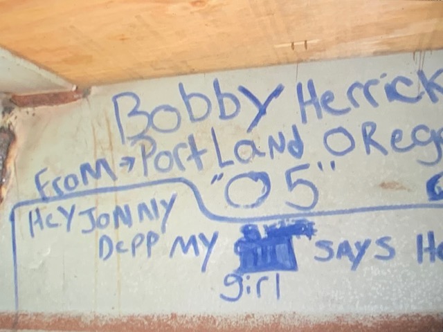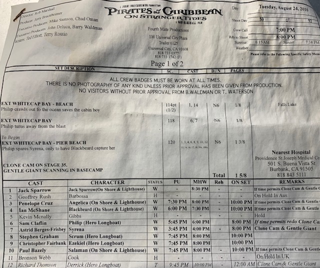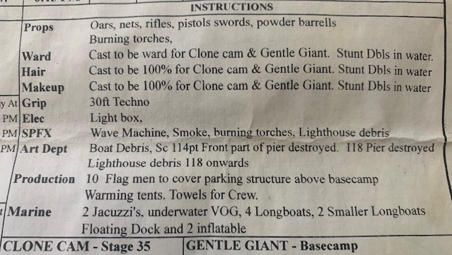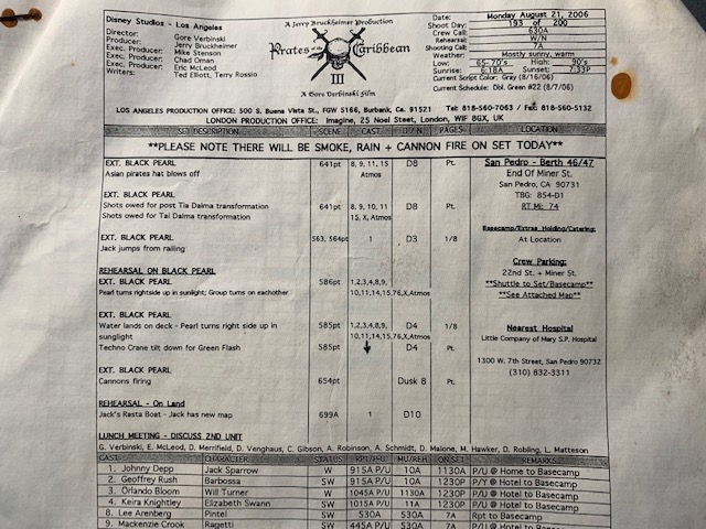 Captain Donnie at helm-The Black PearlWe’re headed out as a cargo ship enters the Port of L.A.That’s one fine anchor…Top deck and below deck boasts cannon after cannon. These hatches open as the symphony of gunpowder and cannonballs fill the air. Throw in some crusty old pirates, and we all had a jolly good time. Rigged for battle…Starboard sidePort side…cannons above and below deck. This is a battleship.I dare ya!The crow top…For whom the bell tolls…Tortuga-that way!A view toward the stern…These light up with candles…The Bow…Port side…What keeps this seaworthy is that it’s built on top of a barge. The rest is art department illusion. This has a motor inside. Dead men tell no tales…Below deck…explosives, fire hoses and extinguishers, special effects stages from below deck.This Pirate ship is actually a barge built to look ancient.These guns work and when stations are manned and the battle commences, it’s as real as it gets!A below deck-love letter for J.DStuff needed- pack accordingly…Long ride back to shore-be prepared.White Cap Bay list…Top deck view, a lighting barge is fastened alongside. This is how this ship gets lit up. We had wind machines on board when we needed strong breezes. The white balloon is a light. It’s filled with gas and would float on its own, so it’s tethered. At the right height, the ship becomes illuminated in a soft white light, like a full moon. It’s quite the sight to see on a dark ocean night. The special effects supervisor is John Frazier, he is a legend. Every time an extreme stunt is needed, call in John. Joe Pancake is the hands on foreman. Safety and proper timing of explosive devices is critical on shows like this, no team does it better.John Frazier HOF special effects master, the gray haired gentleman, here seated in the big chair with Michael Bay. That’s a director that can’t get enough pyro effects. 30 support maritime crafts, a flotilla, assisted and wrangled up everything at sea.Notice, it’s cheaper when your blockbuster intertwines two episodes at once. Resourceful planning reduces the shooting schedule. Due to the major success of the initial film, producer Jerry Bruckheimer enveloped episodes 2-3 in the same production schedule. You know you’re successful when you have that big of a pile of chips.White Cap Bay is located at Universal Studios, Falls Lake…White Cap Bay lighthouse…Universal Studios, Falls Lake. A blue screen backdrop with one of three wave makers in the bay. It’s the blue device peeking out above the surface. Another wave making method I’ve seen used here, utilizes a huge rig that rotates, pounding the surface creating large ripples. Power is floated to it on inner tubes. That’s what Universal provides as a rental for ocean effects. Pirates built a state of the art rig. They don’t need us, they’re all things water on this film. The cheapest way to create small waves is a jet ski cutting loose to chop the water right before the director cries out -ACTION This set, like so many others, was difficult to watch getting torn down. But our water tank is a big rental and gets booked frequently. The cabin in the background is not part of this set. We blew part of that building up for the film Shooter. The tower in between the bay and the cabin had an explosion as did some small boats that had dummies on board. This captain’s wheel is all that’s left of one exploded boat. The torch from above the harbor lighthouse and a bottle of rum are left over props from that film. The bottle is candy glass, hundreds of these bottles were used in a bar room fight done on our backlot in the European Street sets. This show used several backlot locations and rented our biggest stages. Disney cannot fit this show on their tiny lot.Stairs to the beach…Turquoise filtered water greets you. The rock formations are made of styrofoam. This harbor had the smaller landing craft boats. The Dutchman and The Pearl were docked in San Pedro.The lighthouse had a torch lit at night…Captain Jack wrote this to my daughter…I have nothing but cool things to say about Mr Johnny Depp. When he’s in character, which is the entire time, he becomes this captain. He’s not Johnny Depp while in his time consuming make-up, he transforms. He becomes his character. His make up artist is a woman who looks like she too stepped out of this movie. She stands out. While filming the White Cap Bay, filming was all nights. I vividly remember Johnny, chain smoking, sitting in his folding chair at 3 am, looking like a teenager having the time of his life. He is absorbed into his character, he delivers crisply when in front of the camera. Often, no more than two takes are needed. Chemistry between Orlando Bloom and Mr. Depp is as good as any two stars I’ve seen paired up. I think Johnny was born to be an actor, I can see it in his demeanor- he becomes the part, he is-Captain Jack SparrowNext Location, company move to England. Itinerary picture. Pirates 3Hook – on stage at Sony Pictures, this is the one you rent when you need a pit to recreate a body of water-under any conditions. Arnold Gillespie was John Frazier, before John existed. Techniques developed by the MGM wizard apply to all nautical films. This was a ship built never to sail, just look pretty…Hook-Our one handed star! Older than a Flintstone, He’s a Rolling StoneQuite the savvy pair….cigarette in hand-at all times.