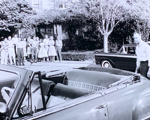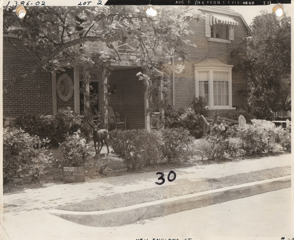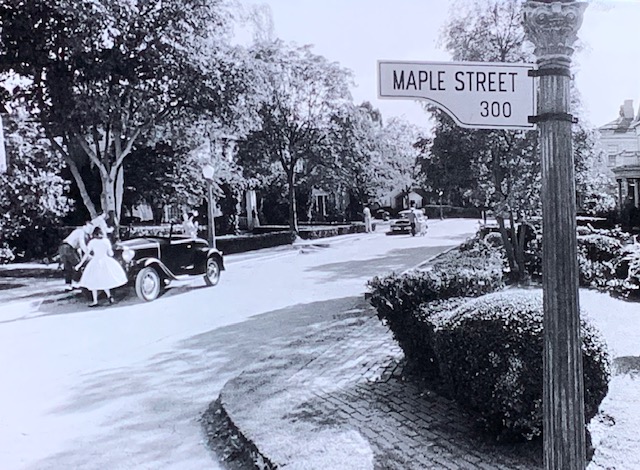 The film They Only Kill Their Masters, starring James Garner, was the first film I saw being made on this street. The set dressing inside a home on the street here consisted of (a wall picture, a table and a chair) which ended up disappearing from one house and reappearing upstairs across the street in Andy Hardy’s house.