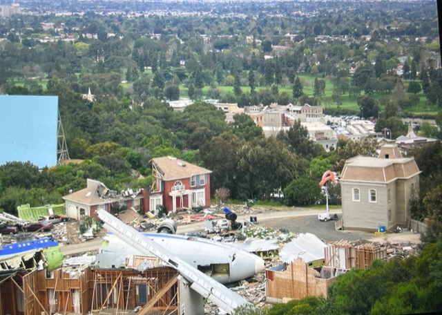 So off to the rescue I go, with a friend and Universal Best Boy named Gene Duffy. We know every road on this lot and quickly drove up to the fire road that buffers the studio from private residences. Coyotes were howling and an attack was imminent. Like a scene from a movie, I pull up to the center of chaos. Zeus was surrounded and wanted our escort off this hilltop. No bribing needed, Zeus jumped in the passenger side and rode back to safety on Gene’s lap. He was safely returned to his handlers who were petrified. A quick examination showed no damage happened. The thick brush Zeus took off through-animal country. If this wasn’t a backlot, it would be a canyon.Seagram’s threw this party for Christmas on our entire backlot. Drinks, gourmet food, snow, petting zoos, Ferris wheel etc. Each section of the backlot was dressed as a theme. Seagram’s dumped 6 million dollars into this event. Let’s toast to Seagram’s, Their brief ownership was very memorable, and that company is first class, all the way. A special thanks to Mr. Edgar Bronfman, Jr. for some very fond memories.My kids would experience all our different owners after Mr. Lew Wasserman passed on, the last of Hollywood’s Movie Moguls.Jingle All the Way set, New York Street.Downtown Minneapolis recreated at Universal City.“I see how my dad loves this place!”Universal Studios location…son Jeff.The Flintstones had sets at Universal and Aqua Dulce, Vasquez Rocks.Vasquez RocksWilma’s wedding ringOur dog Thor visiting another set…Hudson, always wanted to be an astronaut…Here- he could be an astronaut…. Countdown is on 10/9/8/7-blastoff. Today, he sports an engineering degree from UC Davis. I saw it in him back then.Beethoven’s House.A dream come true- her absolute favorite movie dog.Look close, you can see right through this house. To this day, my daughter swears she will own a St. Bernard. A mechanical face exists for facial close-ups. It could move its eyes, ears and snout. It was a metal skeleton that was controlled with pneumatics, then just slip on the face of our star- made of fur and fabric. Nice yards, trams can’t see these sets. LAPD trains up here now and then.For Beethoven, interiors were filmed on stage. This is what it looks like up behind the exterior on the backlot.Up here, where the Leave it to Beaver Housewas sent out to pasture has animals grazing. Deer replaced the Cleavers.The Cleaver’s Home, right side angle. Beethoven’s complex is the closest neighbor.This complex was built for Beethoven’s first film. The Beaver House is top left, yellowish with the orange roof. Itendedup here, up the hill from Colonial Street when The Feature-Leave it to Beaver needed a house that could also film interior scenes inside. They built what still exists today on Colonial. The Backstreet Boys helped “babysit” while I installed an air conditioner on their (Stage 3), a last-minute order. Ironically, after this, she met Steven Tyler on Stage 5, a holding area and costume stage supporting stage 17 and the Aerosmith Rock video “Sunshine.” Christy is wearing 2 different stage passes around her collar. Pretty good for a 6-year-old…On this set, Magic Mushrooms and White Rabbits cast a spell. Another dream come true – Mr. and Mrs. Tanzer, Hollywood Forever together…Alaska dog sledding honeymoon…