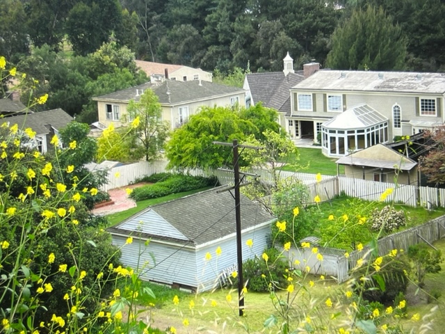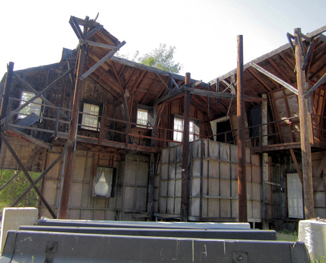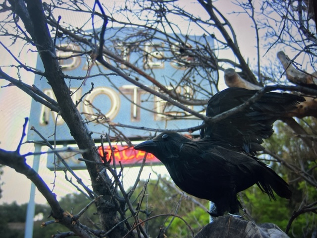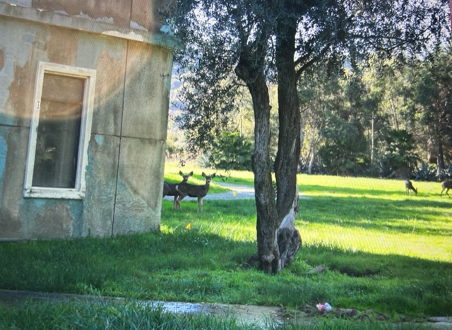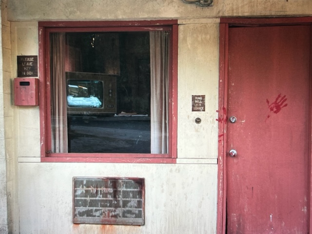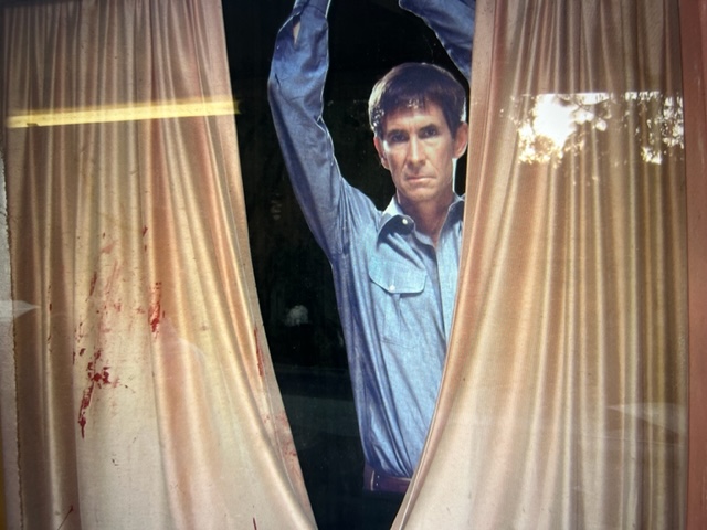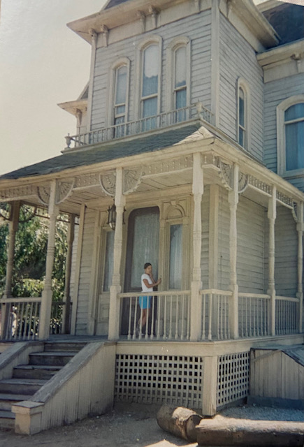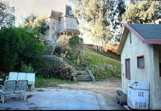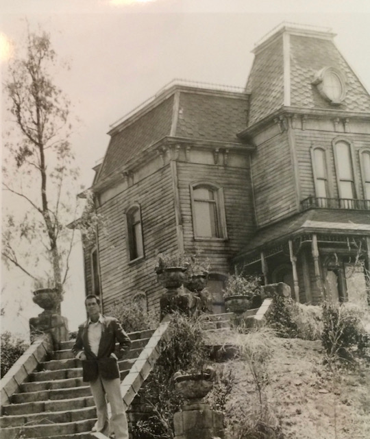 Anthony Perkins is best connected to this estate.Up these stairs-adventure awaits...The path connecting The Bates Motel to The Psycho House.Let’s follow the little girl...“Shall We?” Grandma rocks in her chair as trams pass by underneath her second story window view. My daughter Christy knocking at the front door…”Come-in please.”If that expression doesn’t tell all…upstairs with grandma.Recreation area…Billy Idol…I gave Billy and the boys in the band a tour of Universal. Far and away, the most inspired the group became was when we arrived at the Psycho House. In fact, a member with an impressively strange set of rings on his hand exclaimed “Billy- let’s buy this house!”This is a 5 star hotel– “We’ll leave a light on for you!”Check out…noonCustomers or….suckers!Plenty of affordable rooms…Satellite television…“Pool…just out back. No lifeguard on duty, Beware of MONSTERS“The Psycho House from above, adjacent to the War of the Worlds 747 crash site. Christy and Zeus, one of the friendlier stars on our lot. A few weeks after this picture, Zeus found himself in a pickle. It was dusk on the backlot, the animal trainers were working him in the wilderness area adjacent to the Bates Motel. No filming, just practicing and training was taking place. As day tilts toward night up here, critters come out. Several deer live up here, as do their predators. Those being several coyotes and a bob-cat. This area is like being in Topanga Canyon. You can get lost up here, especially at night. Zeus, a star, is usually pampered, but wanting to let loose his inner K-9, Zeus took off after a coyote. Through thick brush and upwards to the top overview of this studio. Sun is setting and the trainers are in a panic. This is the wrong neighborhood for a star to frolic around.