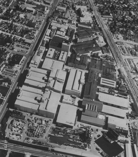 This area has changed significantly as land is valuable. When Air Raid Wardens was filmed, this set existed here at the Dock Tank. MGM Lot 1 used to be loaded with exterior sets, but as more stages were added, exteriors shifted to the backlots 2/3.The stage towering over the smoke stacks is -The Magnesium Corporation.