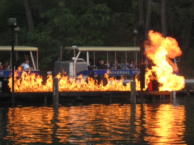 Burning Building…Hollywood Style. This set, or fire is triggered by a garage Genie and is right after the tram exits BattleStar Galactica.