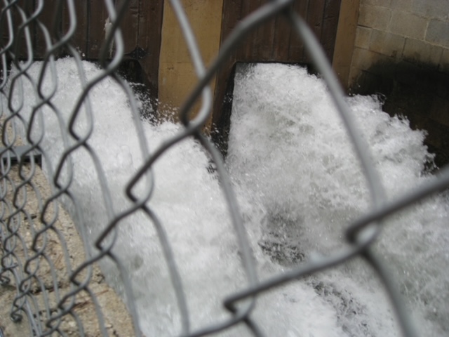 This area above the village below is fenced because 10,000 Gallons of water are released through these two chutes to create the Flash Flood. You don’t want to be- down stream on this slippery cobblestone road when released.