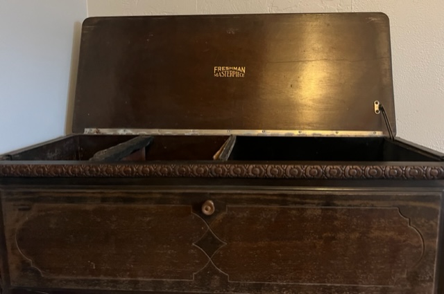 Reflection in the make up mirror. Extremely old item. Everything inside here works.