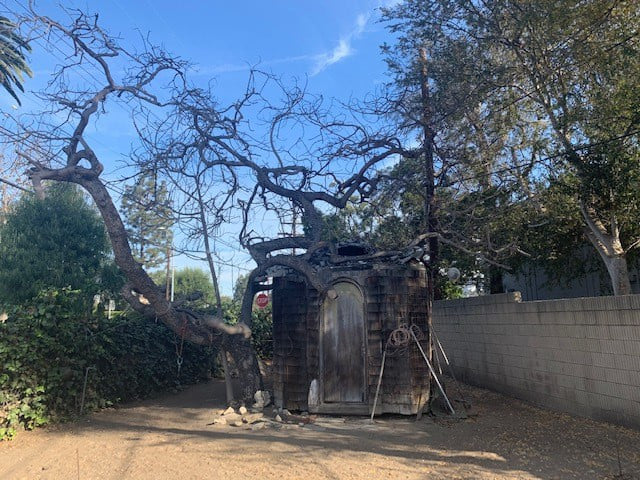 We arrive at the compound. The Batmoblie has been seen parked in front of this house, Hogan’s Heroes camp, Stalag 13 was built behind this estate that had two private walkway fences into the 40 acres backlot. Hal Roach Studios is a short walk. An Our Gang relic was inside..