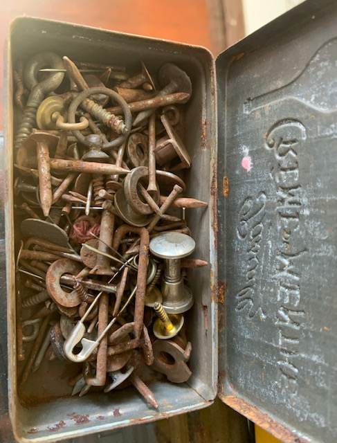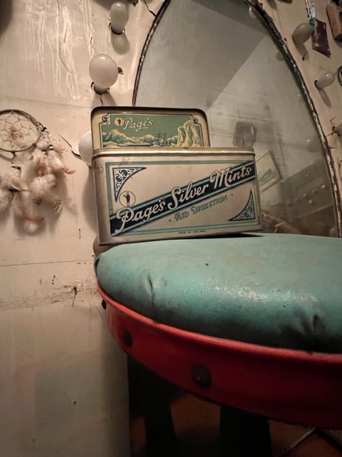 Yet another can of indigestion mints-loaded with fasteners. This would be to hang the trinkets alongside the mirror when that phase of make-up is ready. Also pictures are put up for the artist to match up. Not a lot is available information wise on old Hollywood location make up artists.