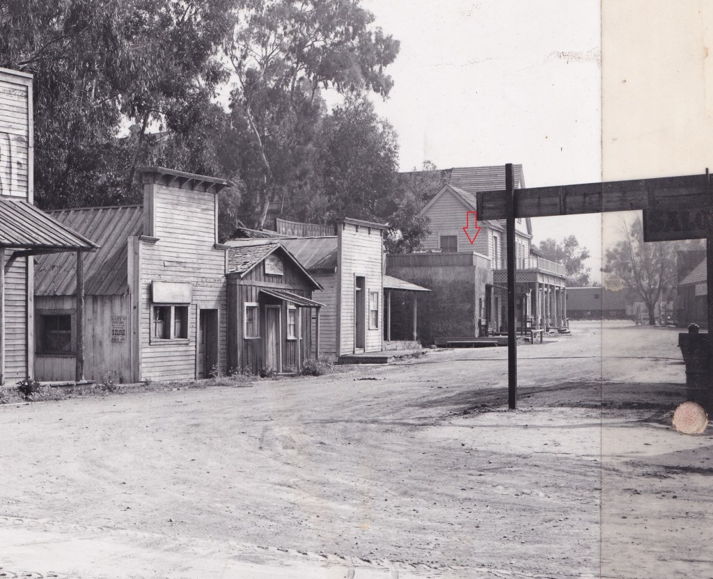 My Art Department Still. Red arrow shows the same location from the opening credits of Dust. Notice the train they moved to block Baldwin Hills. Ghost Town, MGM Backlot#3.