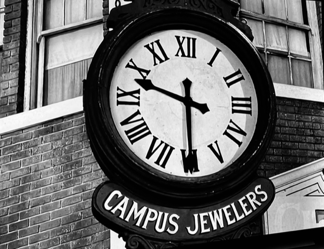 Recognize the clock? This prop gets recycled all the time on this lot. Here being used in Once Upon a Time. Main Street Jewelers is Campus Jewelers in disguise.