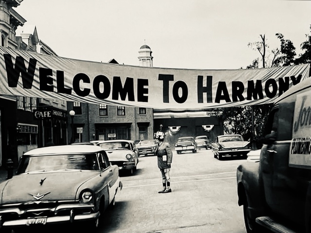 “Welcome to Harmony” ...I’m standing exactly where Buster Keaton is standing under the Harmony banner.This is now a real residential neighborhood called “Studio Estates” but I call it-“Studio Mistakes.” I took this picture at 5-A.M on Astaire Street as the full moon sets in the North -West. Yes, I to was wearing a “sparkler helmet”