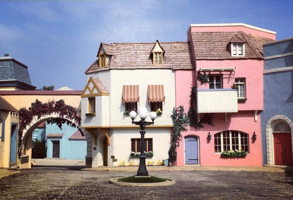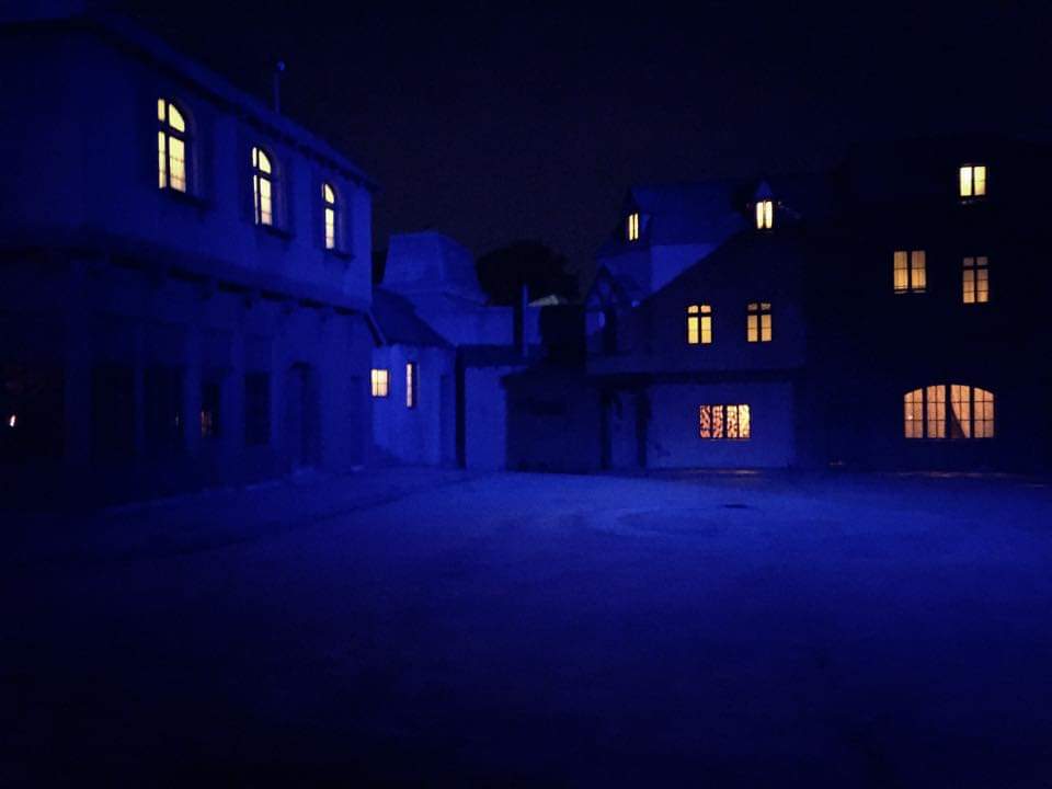 Set lighting has various size lamps inside adjacent to filthy, dust covered windows. These same lights create a “someone’s home feel” when switched on inside the sets interiors. Stairways and uneven walkways help you circumvent the interiors with windows looking outwards at this functioning movie studio. It’s almost “ghostly” inside these buildings. Alterations involving modifications overlap each other, like a puzzle. Stairways to the rooftops have hatches that open like some… Monster movie!