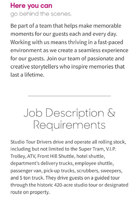 “I wanna drive that famous 25 car tram!”…Be prepared to piss in a cup and have your commercial driver’s license “spotless” with passenger endorsements. This job comes with drug testing. This is an opportunity to join “The Teamsters Local #399.” This ship needs a Captain and a Hostess , endless fun for those lucky enough to be selected to this fast paced, passionate, inspiring environment. Drivers make substantially more than guides do to Teamster Union Affiliation. Steering wheels pay more than microphones but together, you have a studio tour.