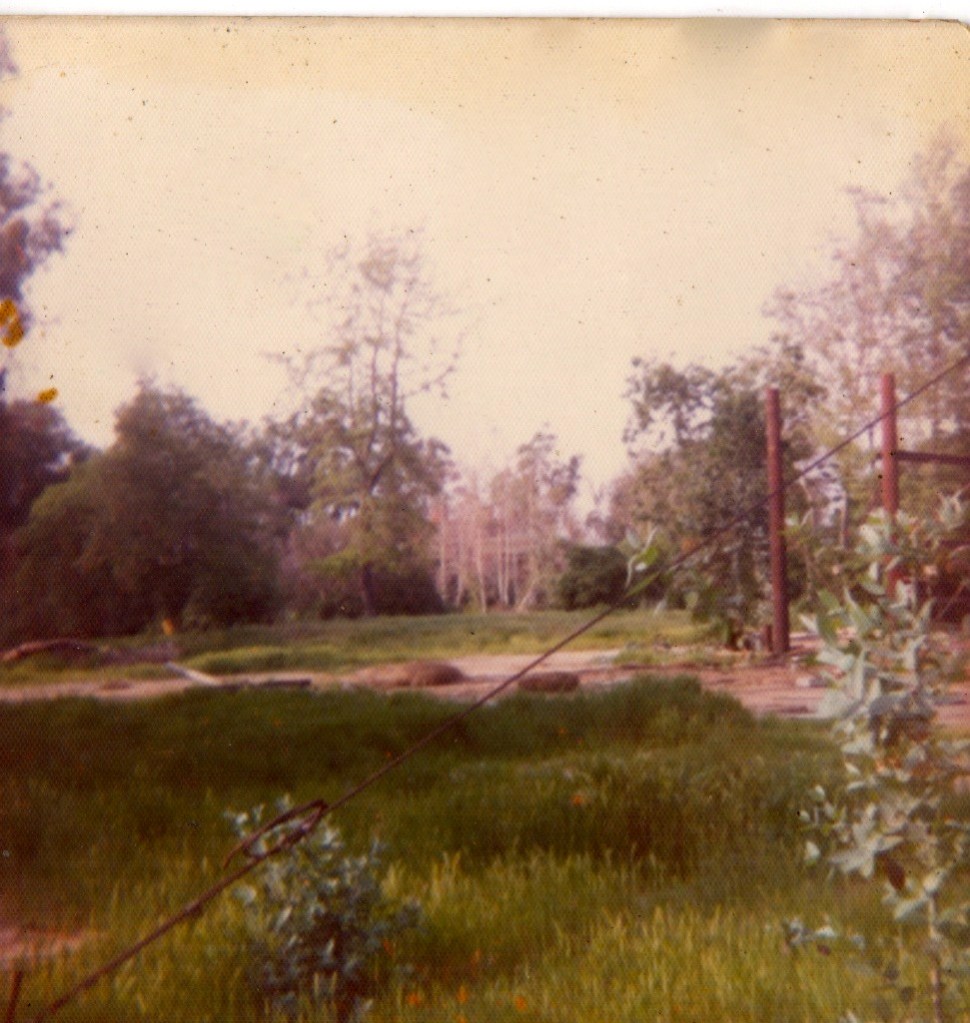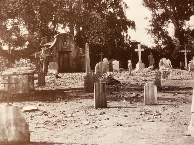 We’re leaving the Train Station and off to the cemetery! –There is a fence in this picture laying on the ground, white and dented, a car crashed through it. It was a traffic accident, not a stunt. Imagine crashing your car on the backlot. I’d keep driving around, leave out the main gate. The studio put a replacement fence in, which funny enough, was the side of a ship with port holes to look in the studio from. That’s the story behind this picture, Look closely, the rear of the train has a guard getting out of the Red Bronco, they patrol this area knowing this is our favorite way in.