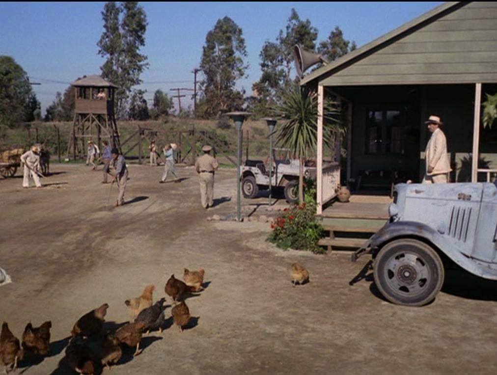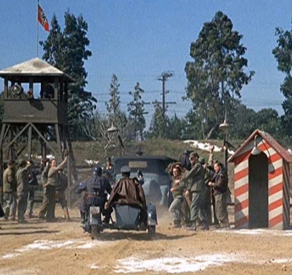 This picture was taken right before Stalag 13 was torn down. It was dressed a bit different for She Wolf of the S.S. They painted the guard shack neutral and added a medical cross on the roof of Klink’s office.