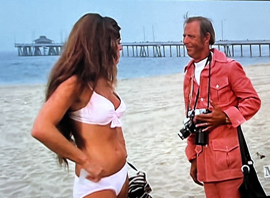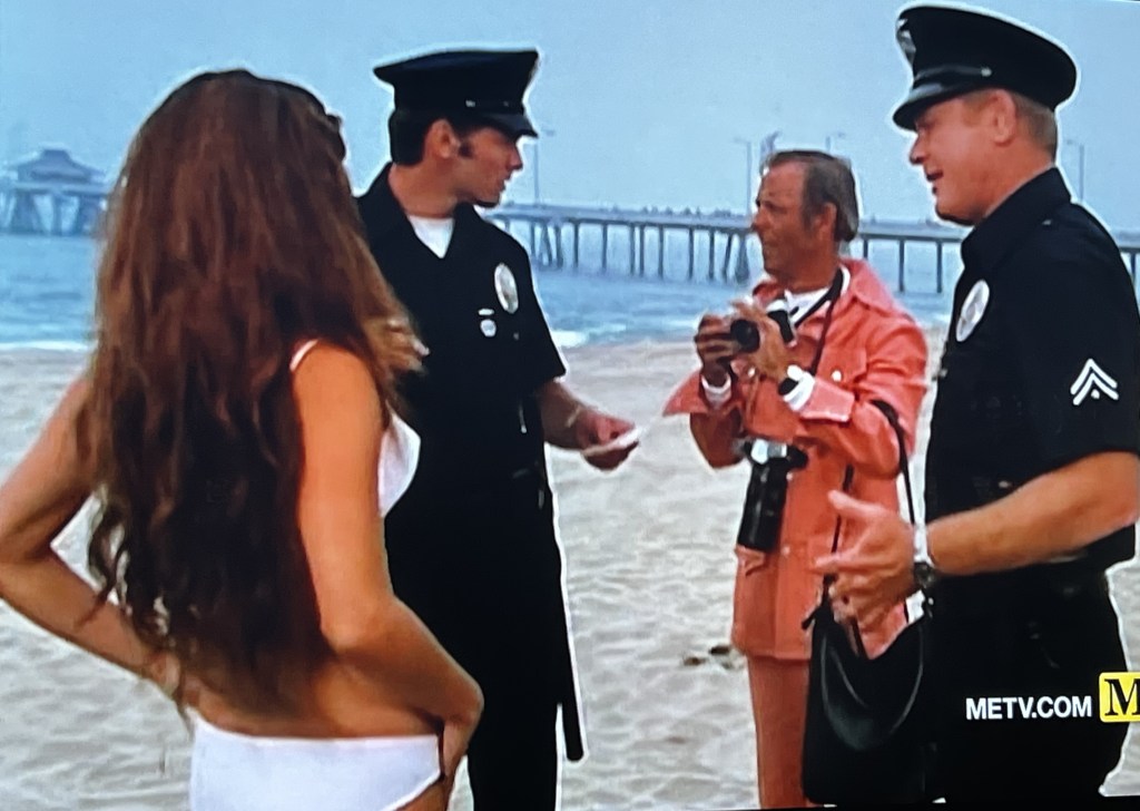 Larry Hovis from Hogan’s Heroes fame became a photographer in this role, Venice Pier is behind the actors. This “citation” is for not having her bathing suit on as cops arrived. A year later, in 1974, Venice would become a nude beach. The only one of i’s kind. A freak show of sorts, I remember well-I was 14.