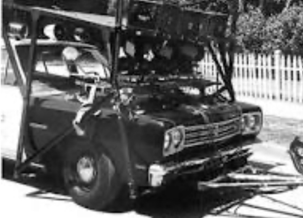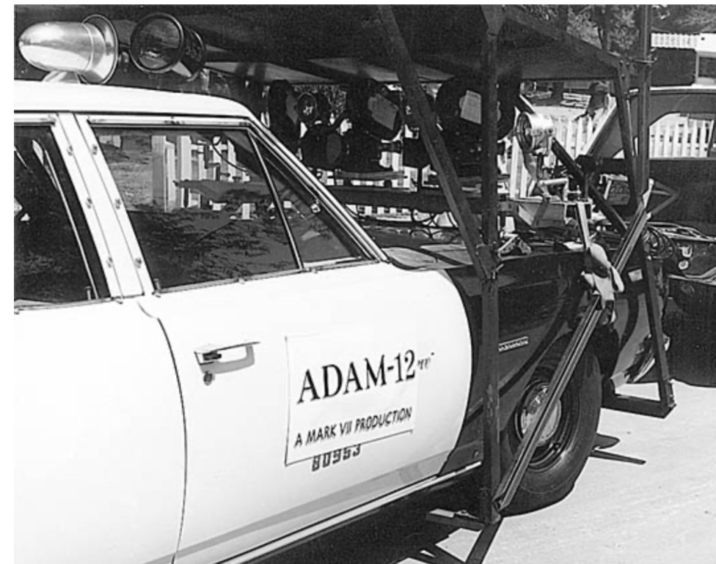 Driving scenes were filmed on public streets, but the most ambitious calls and pursuits often ended up on the Universal Backlot. A platform was developed that held three cameras and was mounted at the head of the cruiser. The center camera captured the two stars in one shot. The left and right camera captured each star respectively.