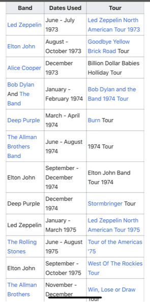 This plane plied the skies in the service of amongst others: Led Zeppelin, The Rolling Stones, Elton John, Deep Purple, The Allman Brothers, The Bee Gees and Peter Frampton.