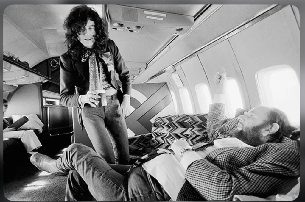 Led Zeppelin’s fearsome manager Peter Grant was know to disappear in the back bedroom, often for the entire flight… and he’s not sleeping.