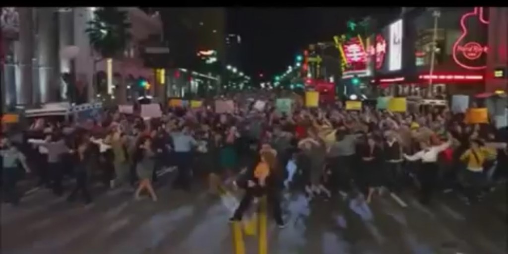 Hollywood Blvd was closed for two nights in January 2011 to film “Life’s a Happy Song,” the final musical number in the film.