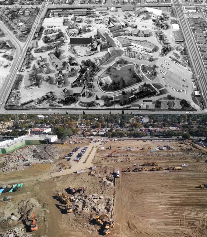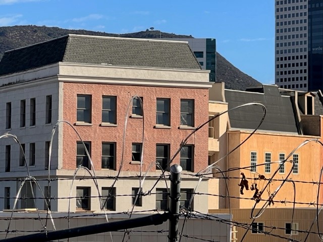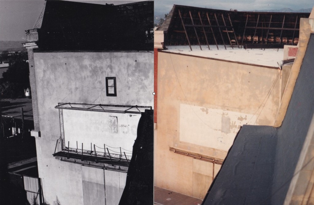 The backside view from same roof-a silver spaceship, off in the distance, left side of building. Subtle changes-years apart