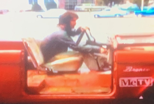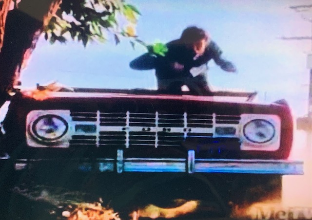 License FJPP, this is the same Red Bronco…I have ran from this so often, scared to death. It was stealth, until security floors it. At night, certain guards drove with out headlights.” Don’t look back until your on top the fence-then you can -flip the Bird!”This is the jeep that terrorized us, minus its white roof, and a passenger seat. It became part of MGM’s transportation and went out on shows.Imagine my astonishment, here I am on Saturday night watching the best show on TV at the time, and I see the license FJPP. I quickly realize it’s my jeep, modified by a show that cuts up cars like a cube of butter and modifies them. No one has been the focus of the front end of this vehicle like me. These headlights have been on my rear end running full speed. I’ve experienced this scene, I had nightmares in the 70’s of this image and the sound of a maxed out engine, with an arm sticking out, packing a salt rock pistol.Chips at MGM lot 2, each evening car wrecks would be dropped off from the location they were destroyed at, it’s how each day ended. This was a full time operation, one of the funner shows you could work on, as a teamster or stuntman, Good times!
