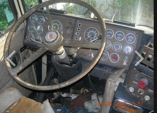 Truck three- the one I jumped on board of... Like a retired horse in a pasture.If this cab could talk-lots of monkeying around took place inside here. Notice the Red Brake knob, lower right. That’s the knob the Bear wanted to pull, it would jacknife the truck. It was hard to get driving scenes done, Bear was a very playful chimp.