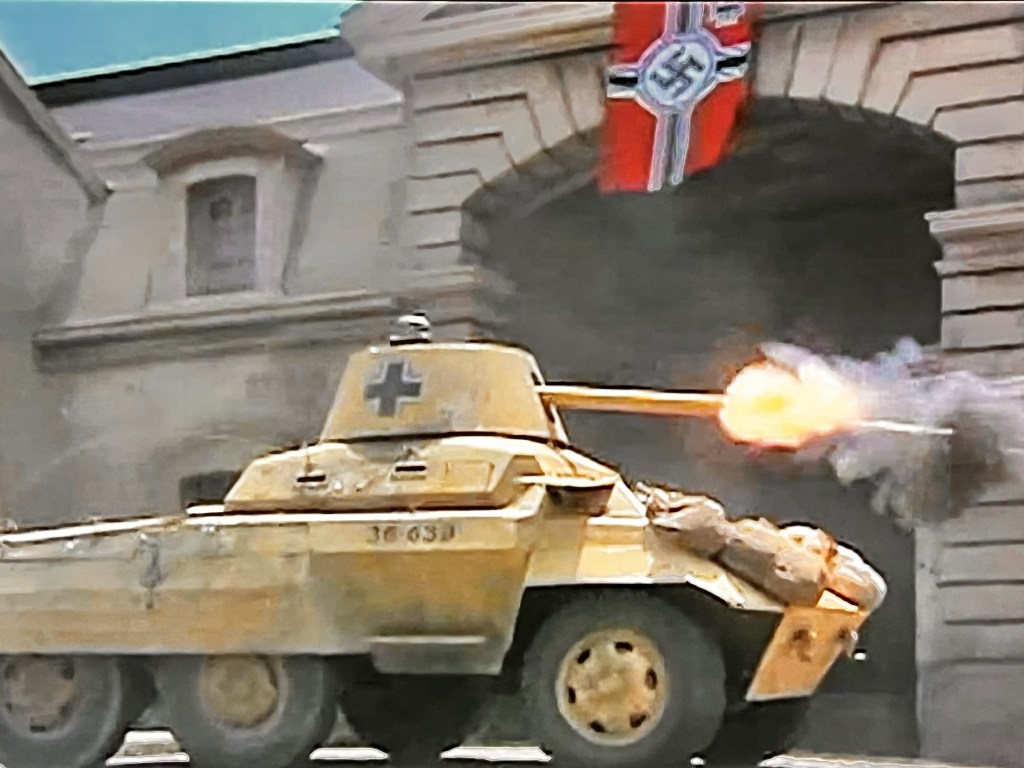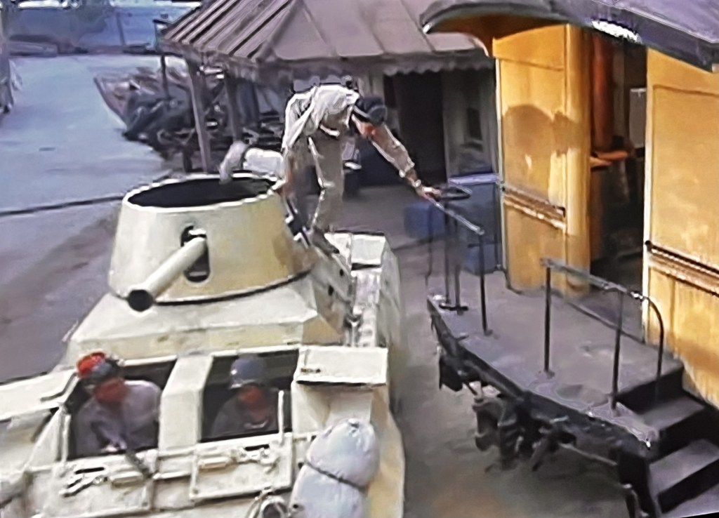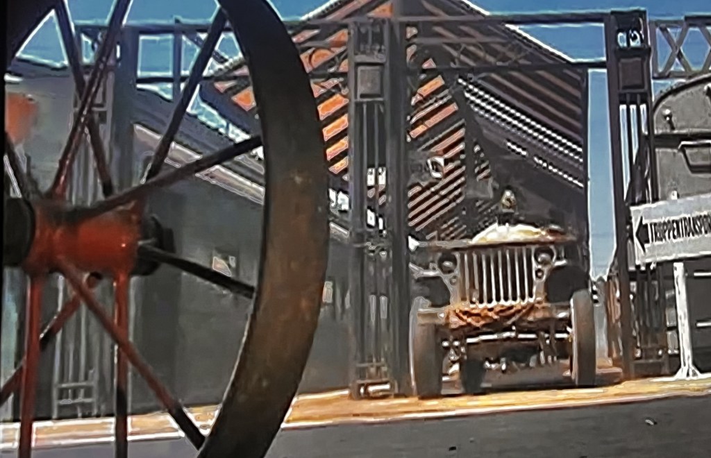 If you have a good eye-the two rows of Pullmans have been rearranged for this scene allowing for more space. there is a 3ft. drop from platform to tracks. The jeeps are moving fast. There is a possibility that you can roll this jeep. This can happen if a wheel goes over the edge even slightly. You don’t need a train engine to jockey train cars-a tractor can move these along the tracks.