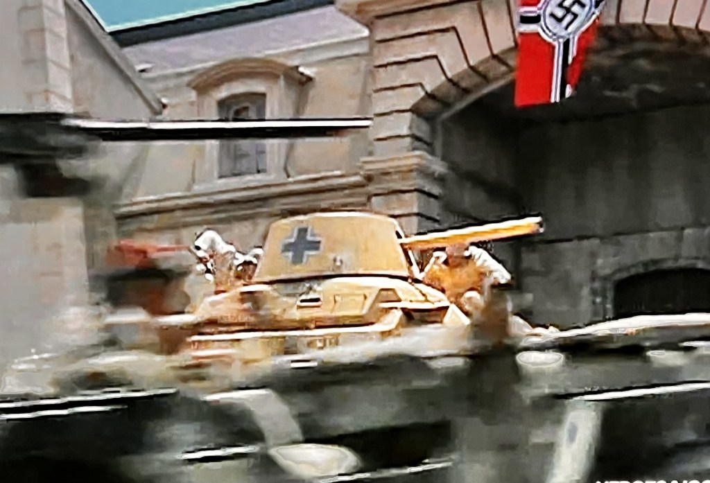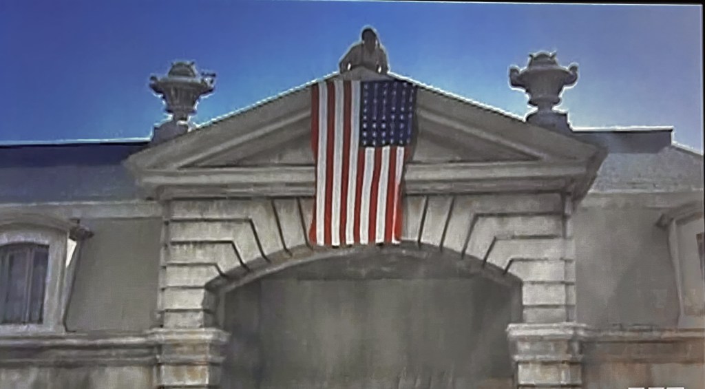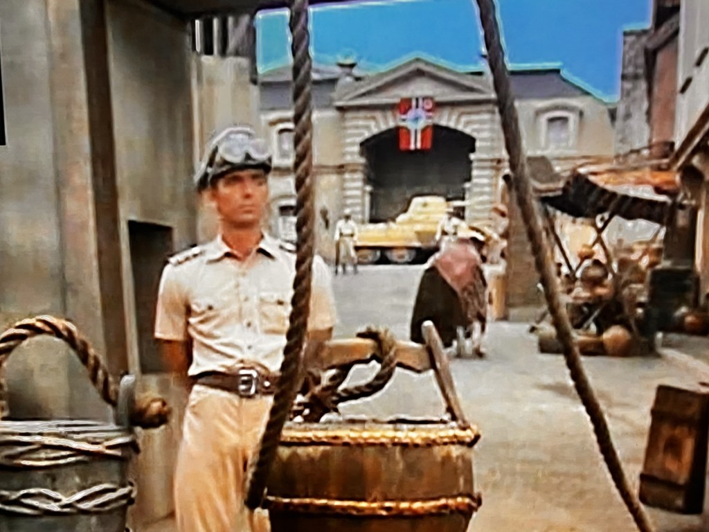 An American Flag replaces a Swastika…A salute to our flag raised above the backlot.