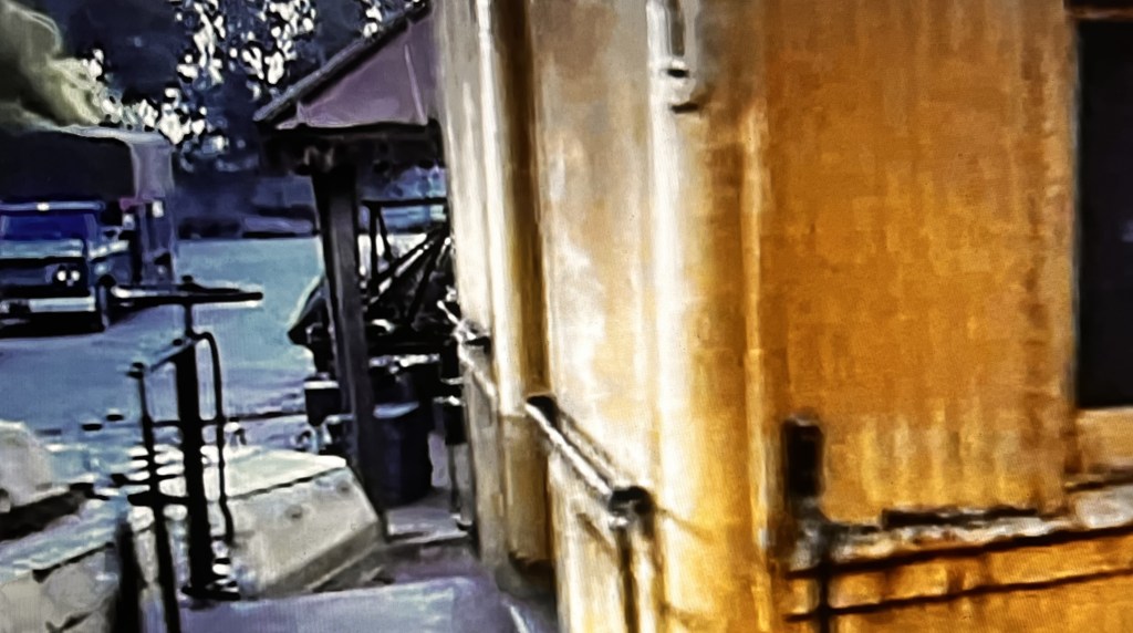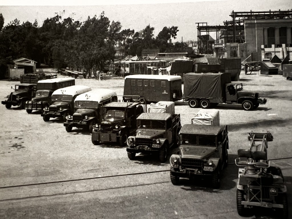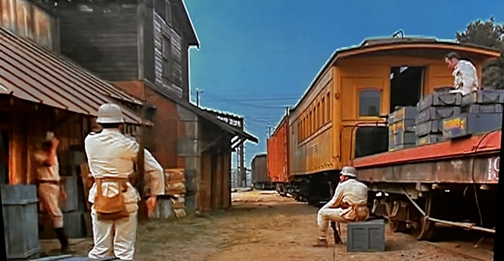 MGM maps indicate where train tracks exist on both backlots. Lot 2, on the left. Lot 3 to our right. The Harvey Girls and Willoughby’s yellow train normally was on Lot 3. But for this episode of the Rat Patrol-it makes like a guest star.