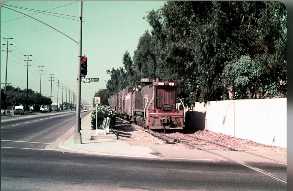 Culver Blvd-Overland intersection. This train passed MGM twice a day, at least. The Backlot 2 is fenced off area lined with trees.