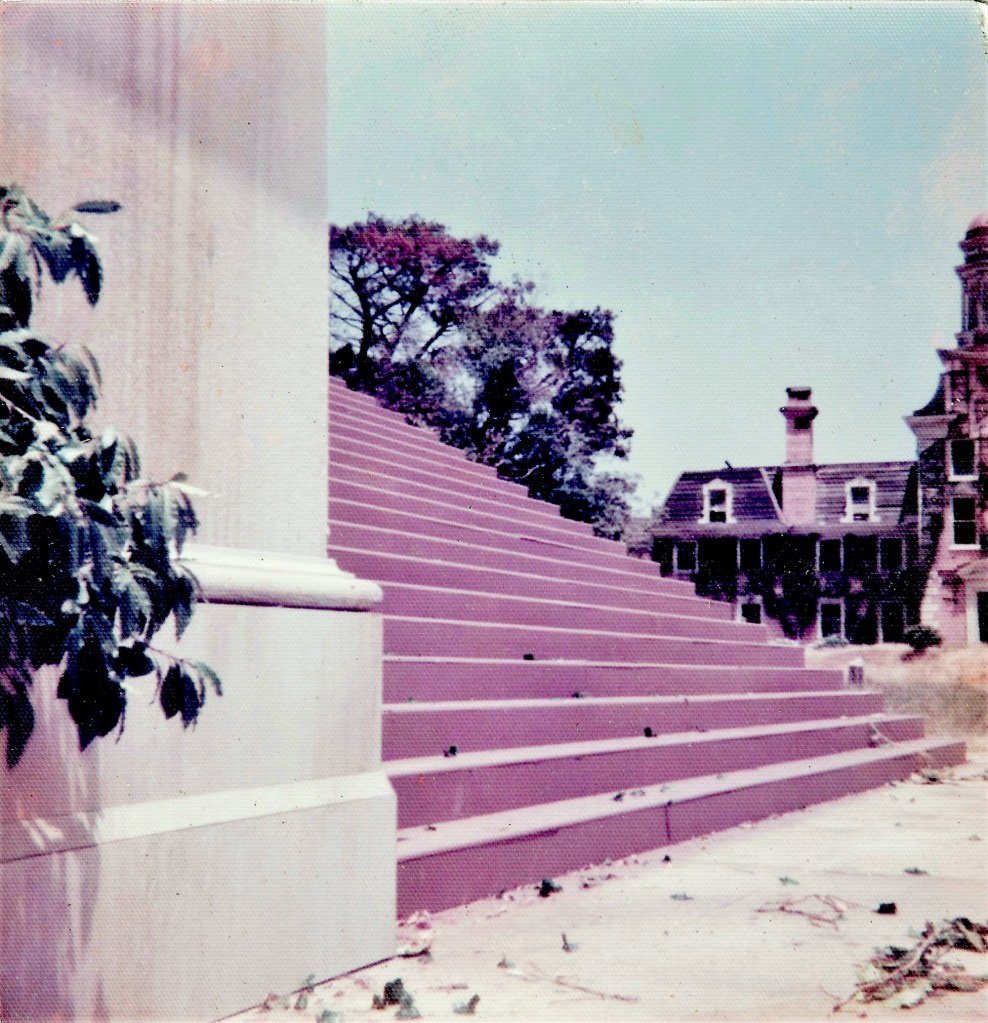 There are three fairly large temporary sets going up here, on old Backlot Number 2. One set is a stairway leading up to the Lincoln Memorial. It is being put together in front of our Boystown fort. The other is a cemetery, which is being moved to a dirt road in between a row of trees. The biggest of the three is the redesigning of the theater on 5th Avenue.