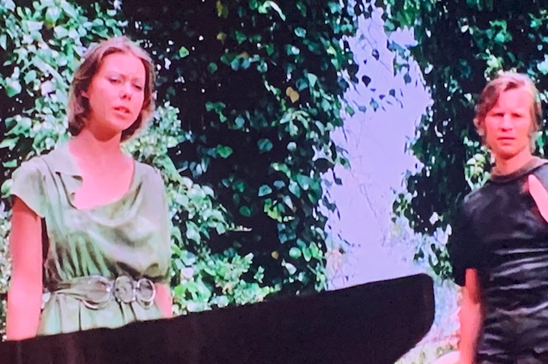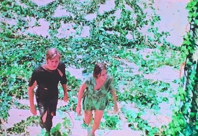 The stair scene is a wrap. Next is the cemetery scene, but trees are blocking our view. As the leaves blow, we struggle to see through and become antsy. We want to see what the female star is wearing, which isn’t much. We decide to come down from the church and make like we’re part of the crew. We know better than to gawk, but we whisper to each other at the same time… “That’s Michael York from “The Island of Doctor Moreau”. But neither of us have seen this woman. What we do see though, seems to be everything!