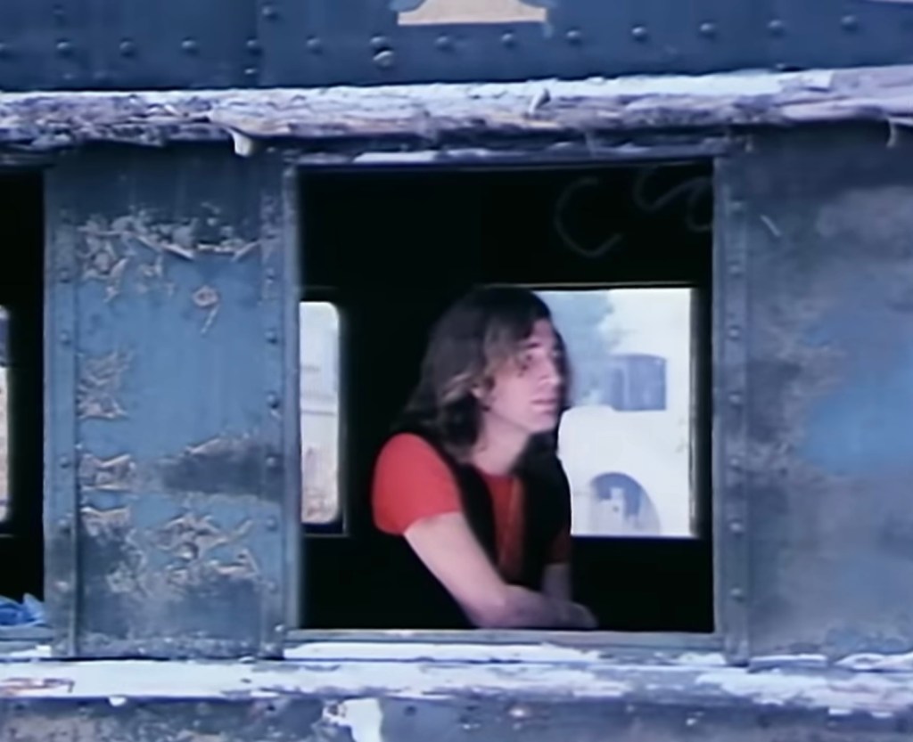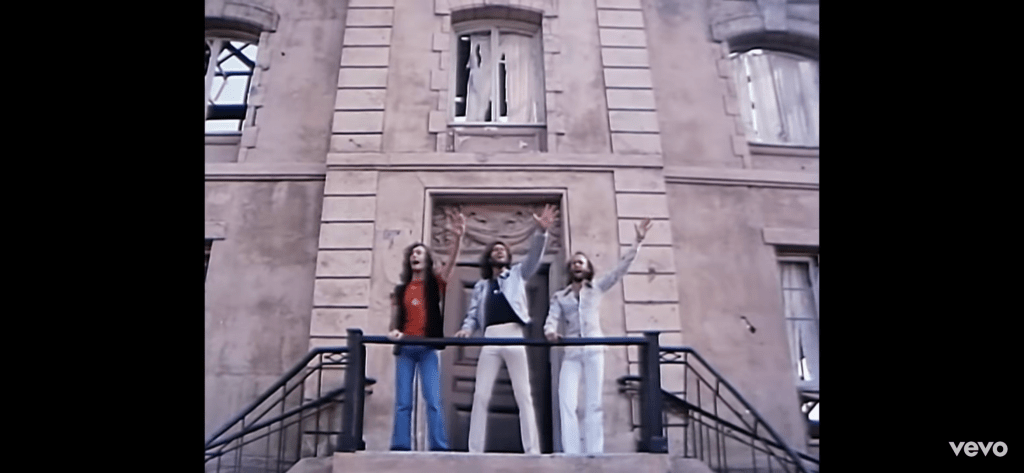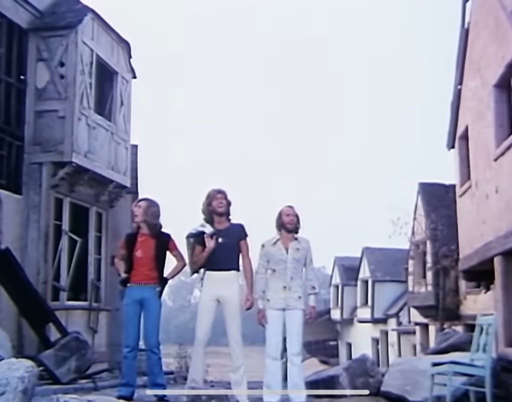 Speaking of Rockstars, a Dodge Van full of Bee Gees has stopped at the same train station we just passed through. A camera is being unloaded with the band. We have a birds eye view as Danny comes out of his trance at the sight of Barry, Maurice and Robin Gibb. Thinking we are watching Sgt. Pepper being filmed, we are suddenly surprised by the pre-recorded song that is being played through an audio system.