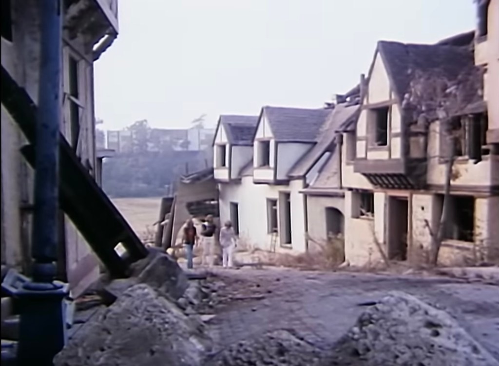 They were just filming in Heartland but now are performing their own music on an adjacent set. As if the wind blew the band in our direction. We are situated between two active film sets. The Bee Gees are double dipping on both. We have holes up in this steeple so we have 360 degrees of backlot vision. Some existed, some we made, so we can keep an eye on security when in or around Copperfield Street. We are safely tucked in this church belfry while movin’ and groovin’ to the sounds of tight three-part harmonies on a dark dusty dance floor as The Disco Kings strut up the street.