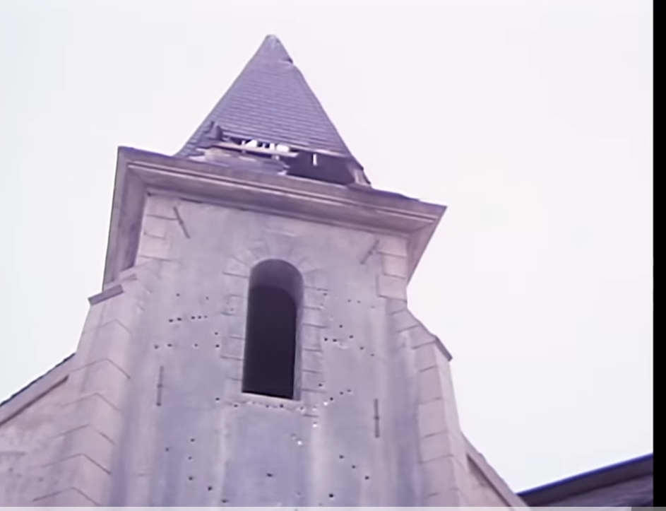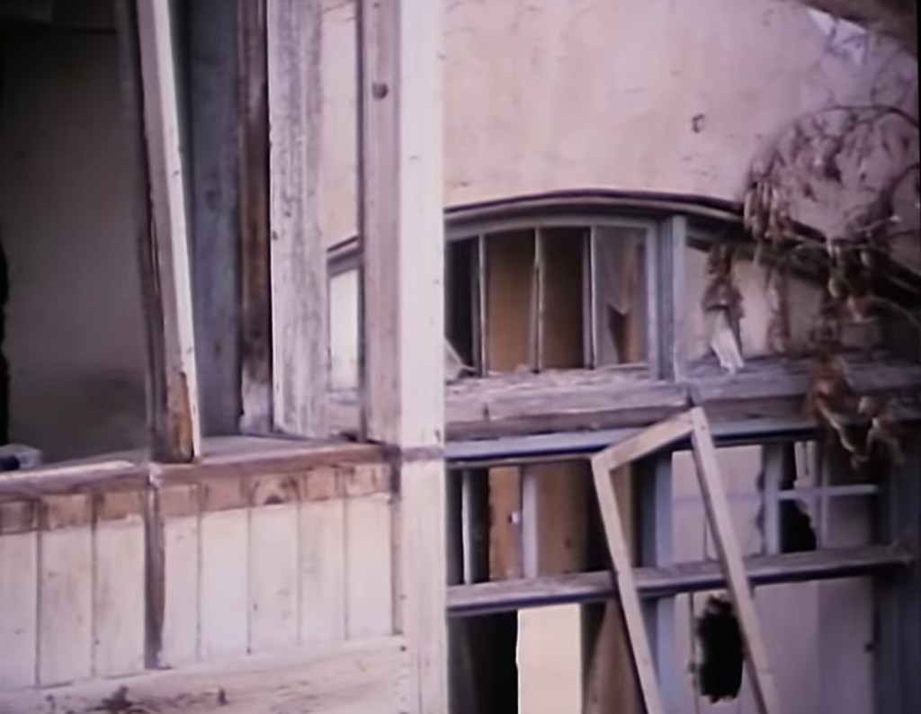 Still in church tower, video switches from rail depot to front porch of this building on left side of photo.