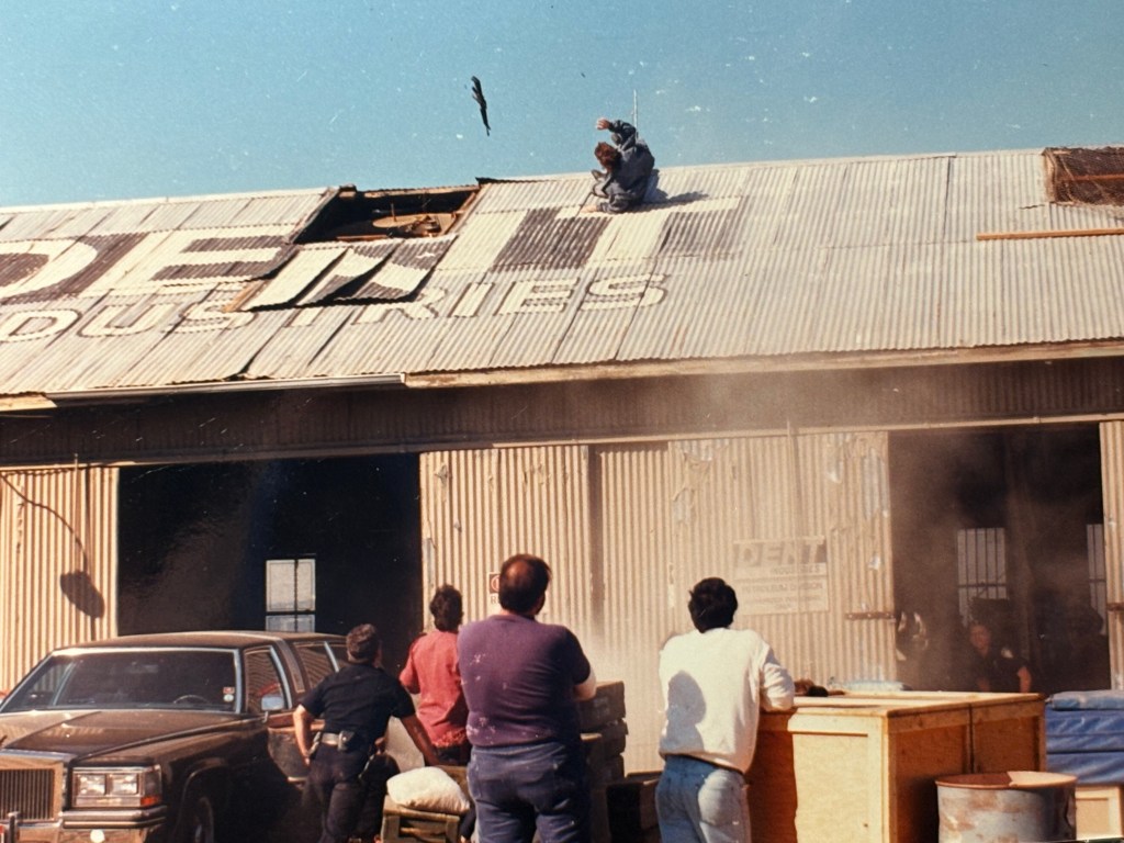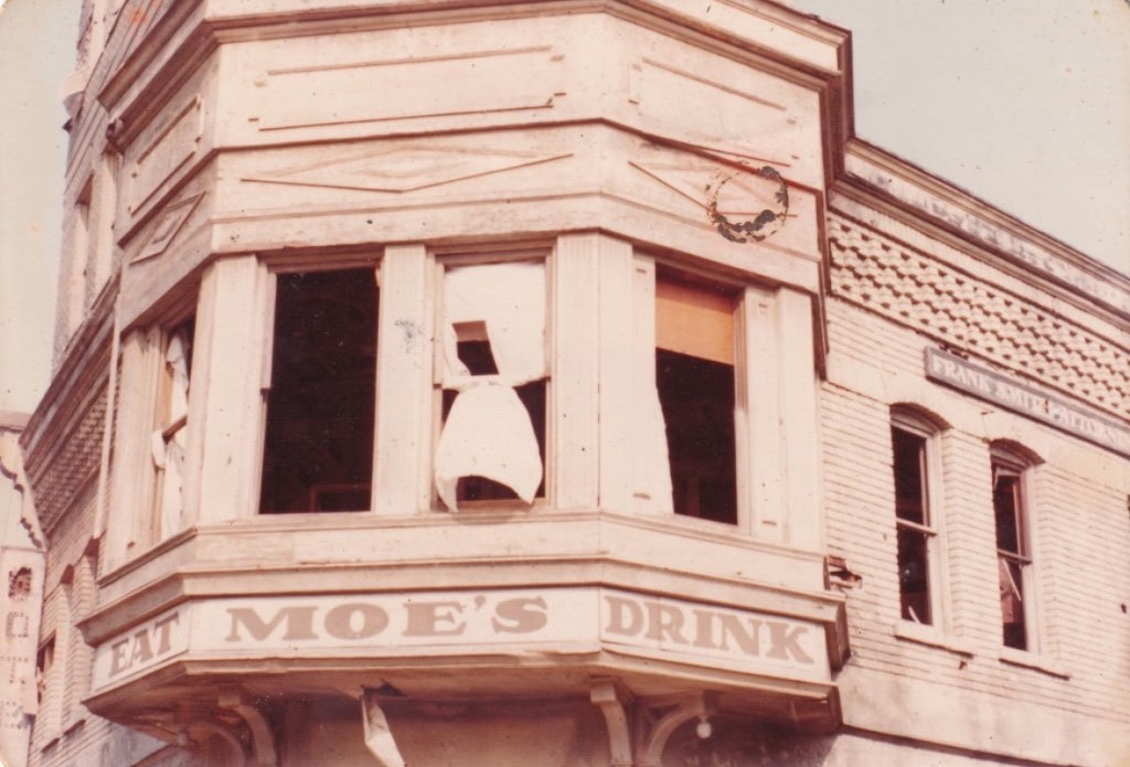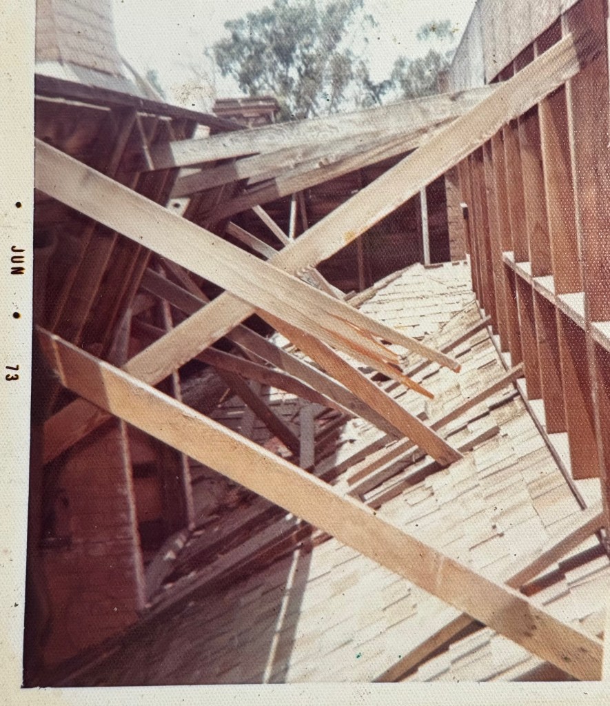 I almost died when the roof of this bank fell through. Half my body was dangling in the upstairs windows. My upper torso was precariously balanced on the roof. This was possible thanks to my camera strap.Quite a sight indeed. The story just begins up there that wonderful Merry Christmas Day in 1975
