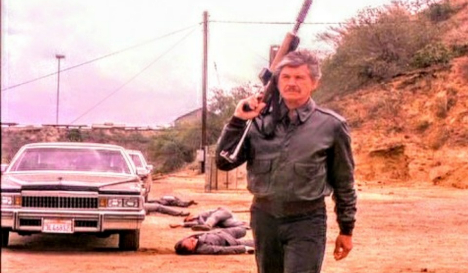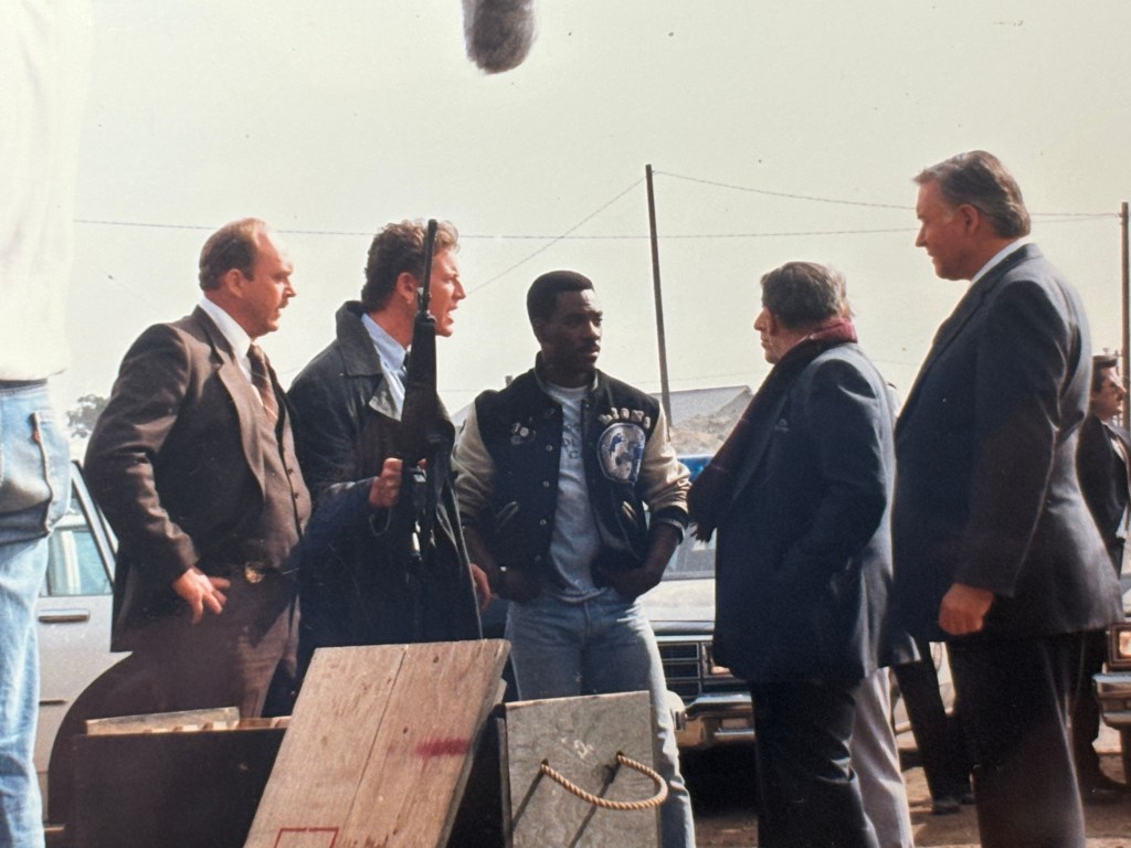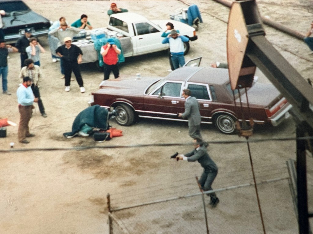 Death Wish 4 is on every dashboard in all the production vehicles. Ironically, this is a MGM Film. We are above the former MGM Lot 3 for these action sequences. As I malinger myself around set I manage to capture a close up of one of my all time favorite stars…Charles Bronson.
