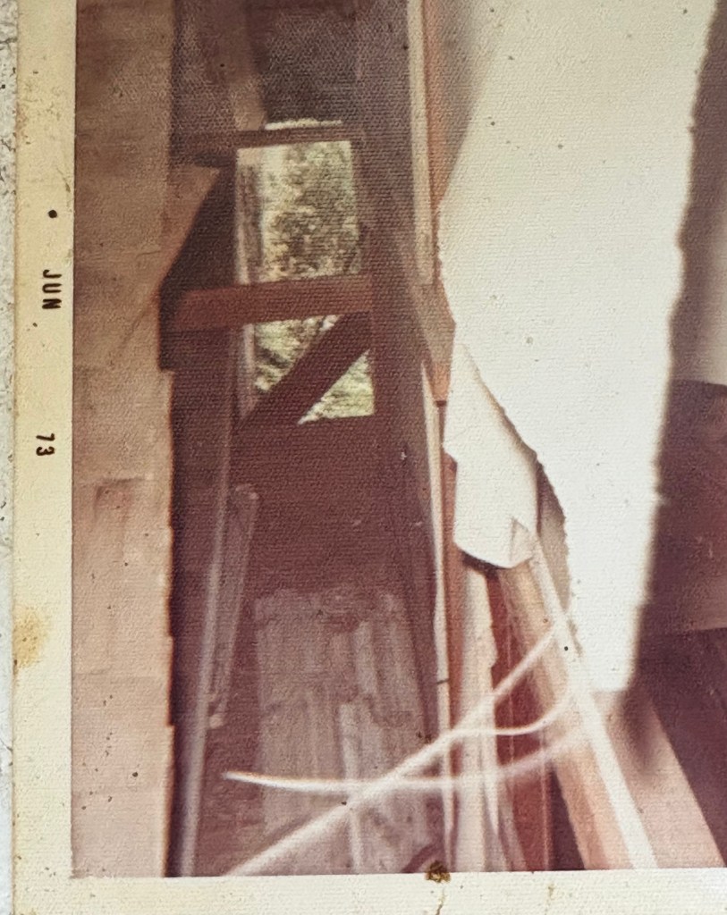 Left pic-The Gap between the original front exterior to the refacing addition extending this section past the original. What all this does is create a maze with a hidden ladder wood built into the wall and passages that even a police dog could not overcome. I know this for sure because…THIS PLACE IS BATTLE TESTED.