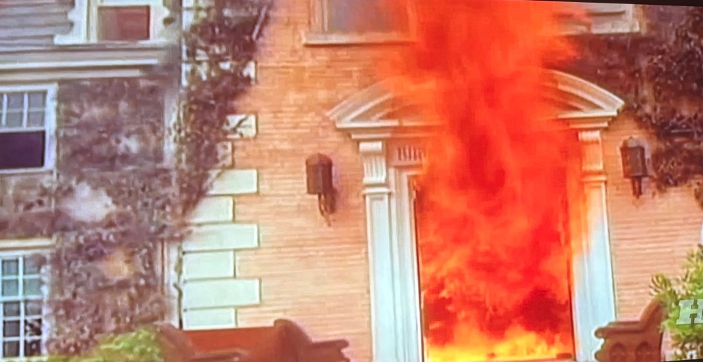 This is where the rubber meets the dirt road that surrounds this college campus in so many films. We hear the clomping of footsteps climbing higher and higher. Police at the front door try to call us out on a loud speaker, but instead we climb out onto rooftop and climb up into a chimney. Each side of this structure has one. There was no place left to hide as our fort is being invaded.