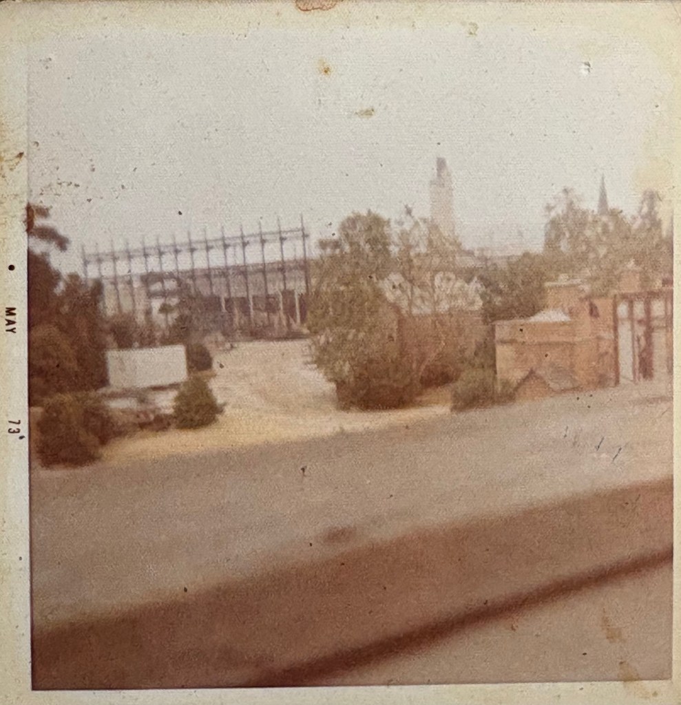 Picture I took in 1974 of fort from a rooftop in Small Town Square. A work light and tombstone can barely be seen. This set below the fort is a graveyard where Dr. Frankenstein and Igor exhume a body, in the pouring rain. This was a “hot set” and a guard was located there, Transylvania Station is right around the corner…