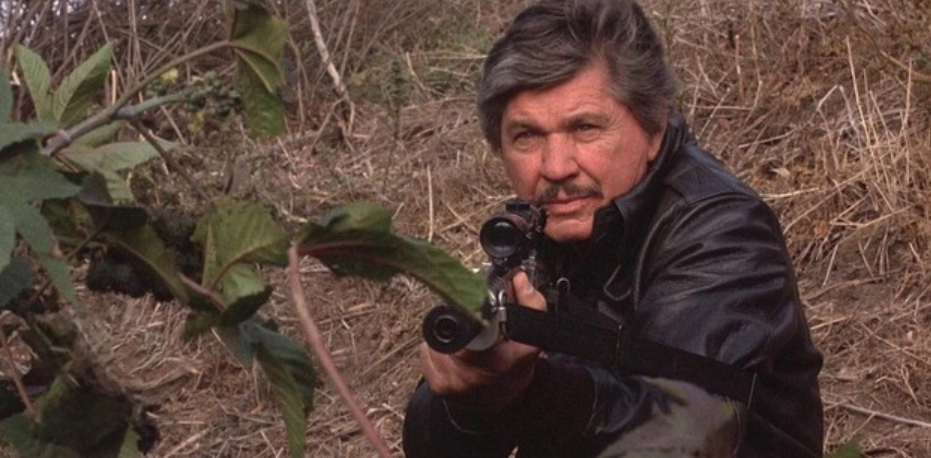 Charles Bronson, in a sniper position here firing towards a Plexiglass covered camera lens and operator.