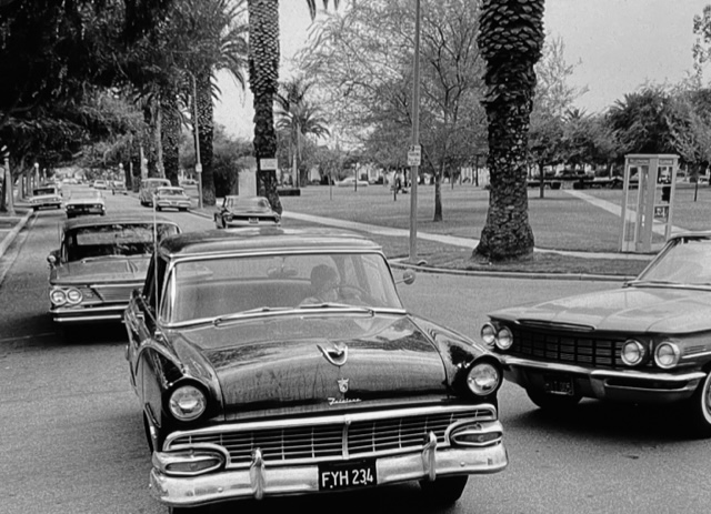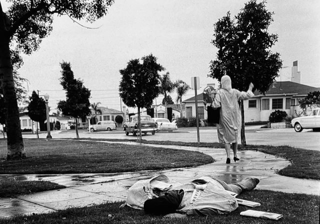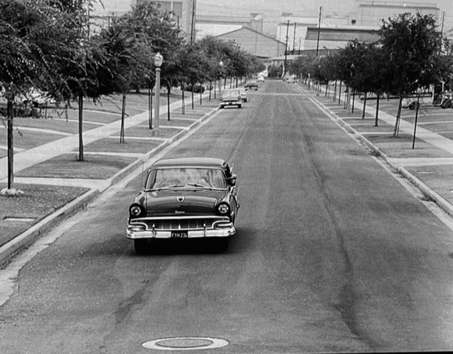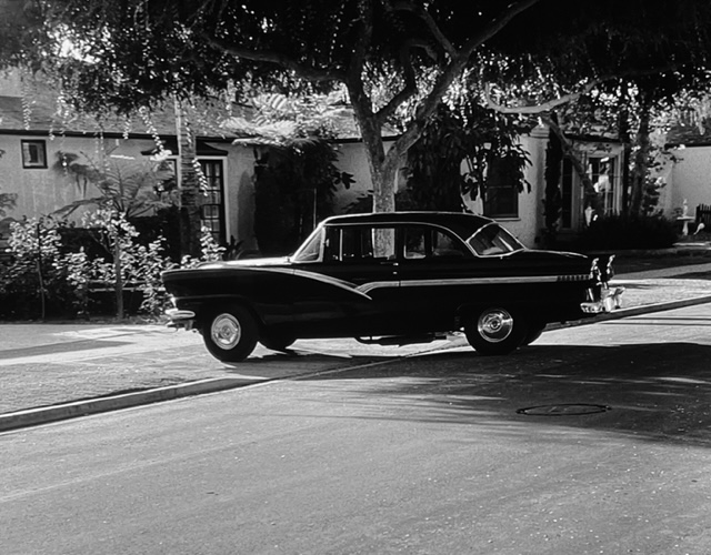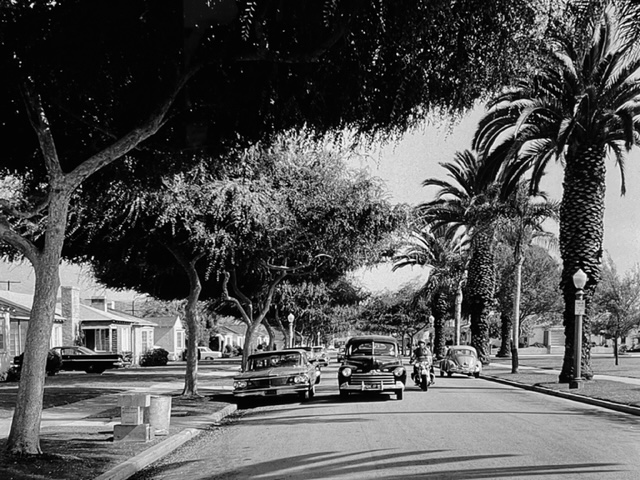 The hills in the background is where MGM Lot 3 is located. Good old fashioned metal trash cans were how refuse was collected, and cool cars had paneling.